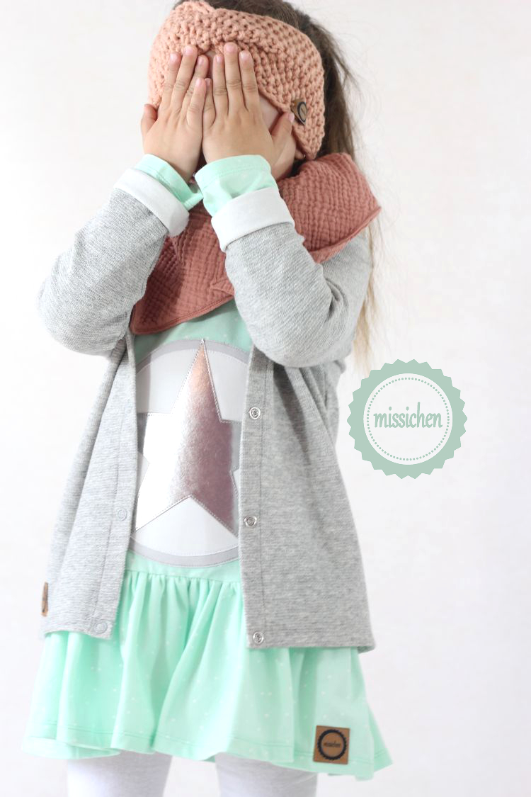 Zu dem Kleid habe ich dann noch eine neue Strickjacke genäht. Unsere alte graue war noch Gr. 92 und nun sowohl zu klein, als auch einfach nicht mehr schön. Nichts wurde hier so oft getragen, wie unsere Strickjacken. Daher gab es nun eine neue in Gr. 104 (wann bist du so groß geworden?!) aus tollem Stofttouch von Lillestoff nach dem Schnitt 'Mimo' vom Milchmonster.
